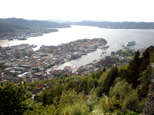 1)Una parziale panoramica di Bergen, la Venezia del nord, circondata dal suo fiordo. In fondo l'Atlantico. Dall'alto del terminale della funivia a più alta pendenza in Europa. Immagine: